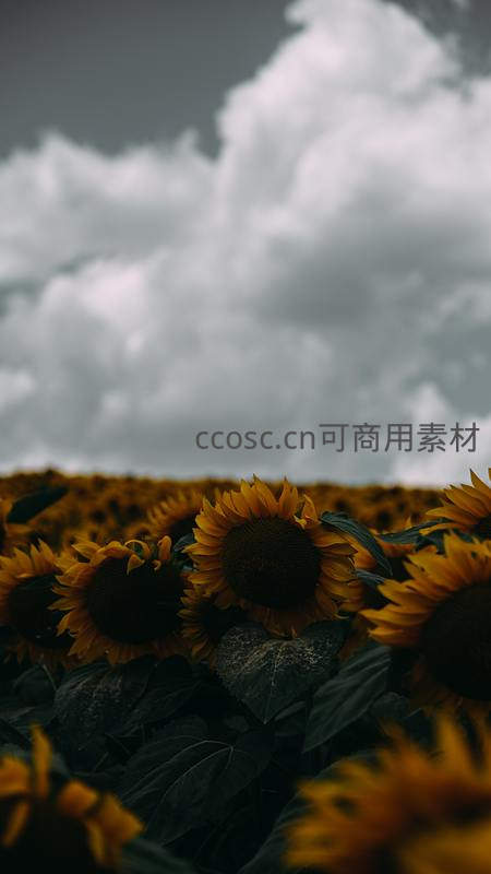 厚重灰云笼罩天际,向日葵在暗调背景下依然挺立,展现生命在逆境中的坚韧与沉默之美。