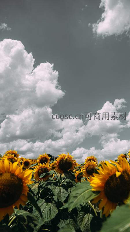 从低角度仰望,向日葵昂首朝天,与翻滚的白云形成强烈视觉冲击,凸显生命的向上与自由。