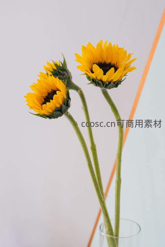 三朵盛开的向日葵插在透明玻璃花瓶中,背景简洁,橙色线条点缀,展现自然与生活的和谐之美。