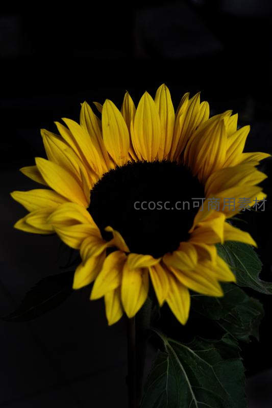 一朵盛开的向日葵在纯黑背景下,金黄的花瓣与深色花盘形成强烈对比,突显其生命力与艺术美感。