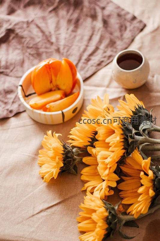 一束向日葵与切开的柿子摆放在亚麻布上,旁边是陶制小杯,营造出秋日午后温暖惬意的生活氛围。