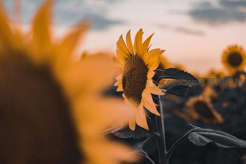 在温柔的黄昏光线下,一朵向日葵被特写捕捉,花瓣金黄,背景虚化,展现出自然的宁静与生命的活力。