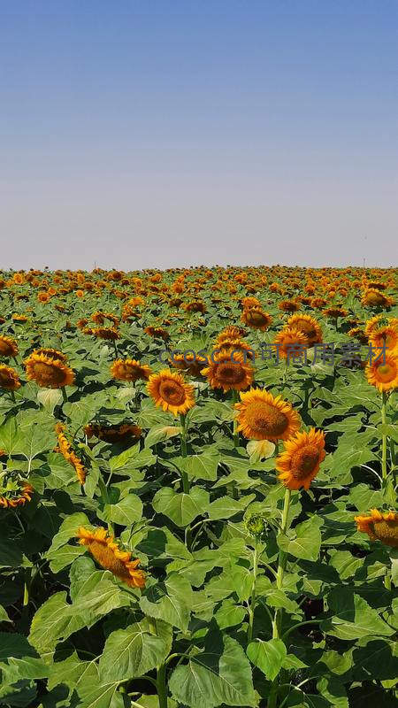广阔无垠的向日葵花田在蔚蓝天空下盛放,金黄花朵与翠绿叶片交织成一片生机勃勃的田园画卷。