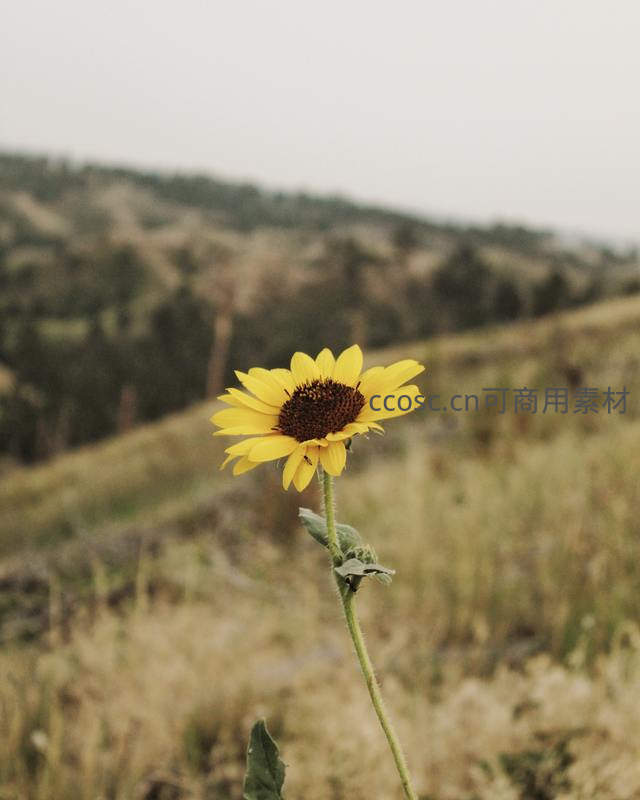 一朵挺拔的向日葵独立于起伏的山坡之上,背景是柔和模糊的丘陵轮廓,画面简洁而富有诗意,传递出宁静与坚韧的生命力。