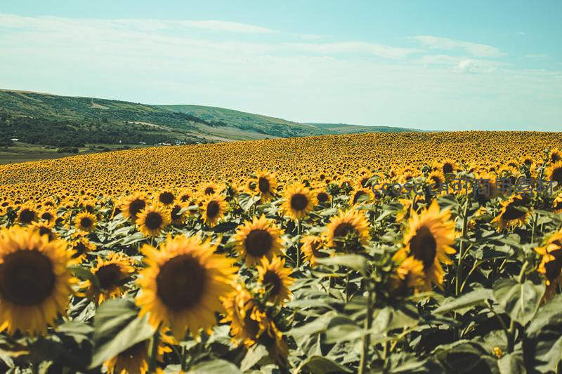 一望无际的向日葵花田在晴空下延伸至远方山峦,金黄色海洋与碧蓝天空交相辉映,展现出大自然的壮丽与农业种植的丰饶景象。