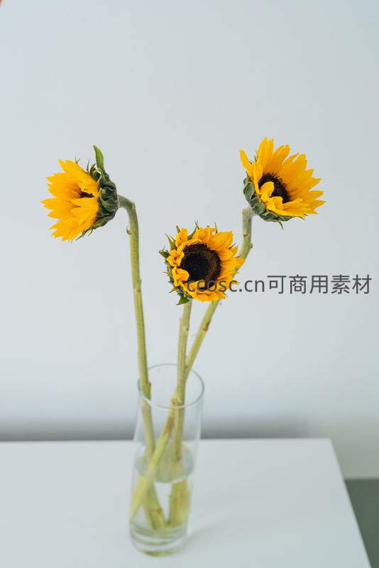 三枝形态各异的向日葵被插在简约的透明玻璃花瓶里,置于纯白背景前,营造出宁静、温馨的室内装饰氛围,展现生活中的小确幸。