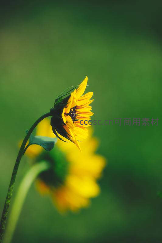 侧影向日葵在绿意朦胧中低垂