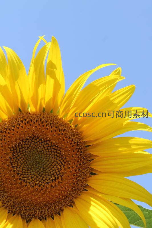 从低角度仰拍盛开的向日葵,花瓣在蓝天映衬下格外鲜亮,花蕊纹理清晰可见,展现植物向上生长的生命力。
