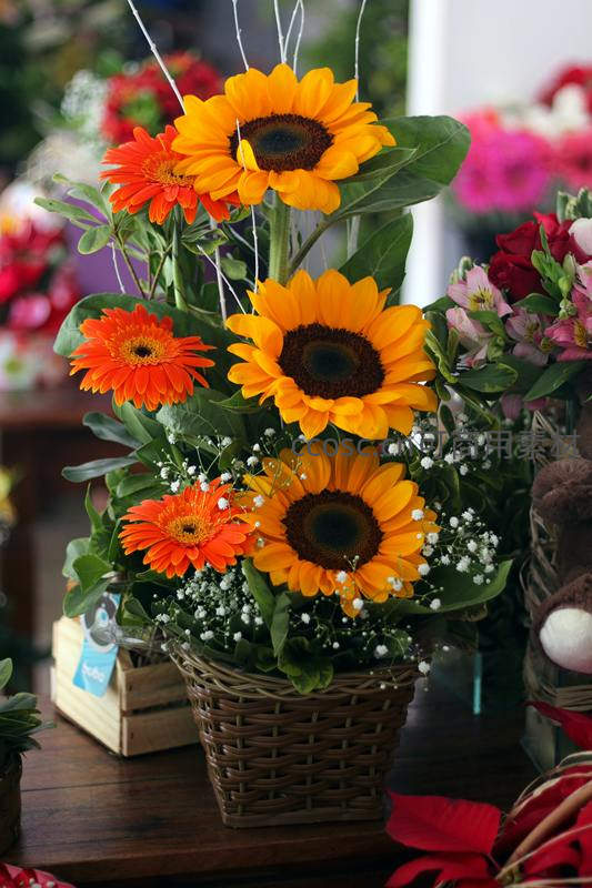 编织花篮里盛放着几朵向日葵和橙色雏菊,点缀着满天星,色彩明快温暖,适合作为节日礼物或家居装饰,洋溢着喜悦气息。