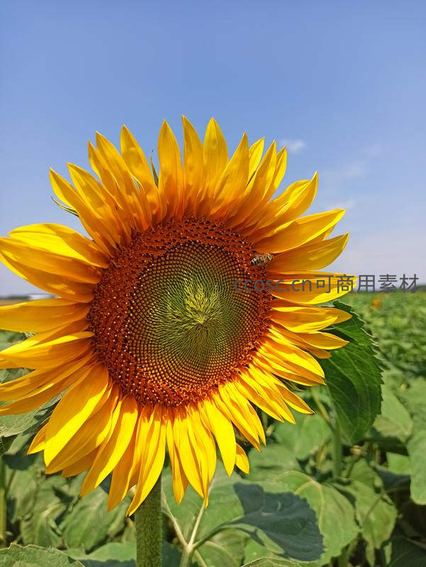 一朵硕大的向日葵在蔚蓝天空下迎风绽放,一只蜜蜂正在花心辛勤采蜜,展现自然生态中动植物和谐共生的美好瞬间。