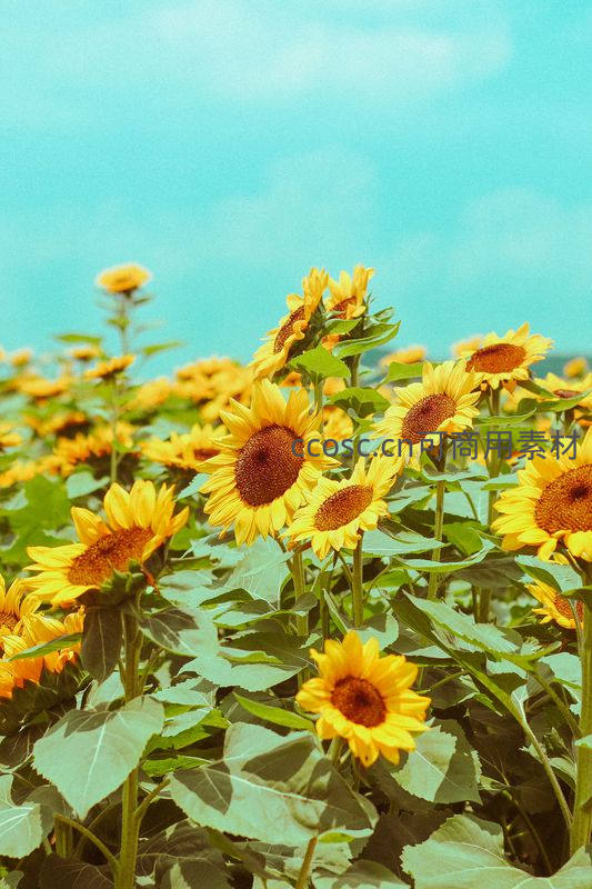 大片向日葵在碧蓝天空下迎风绽放,金黄花海与翠绿叶片交相辉映,洋溢着夏日阳光与自然活力的气息。