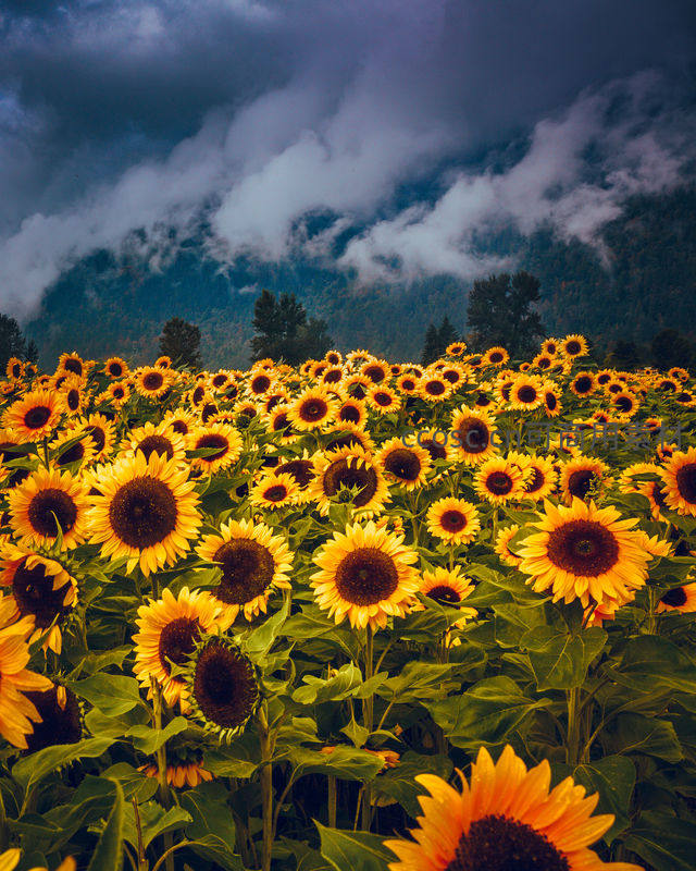 在翻滚云雾与苍翠山峦的衬托下,大片向日葵如火焰般热烈绽放,形成强烈的视觉冲击,展现自然界的磅礴与绚烂。