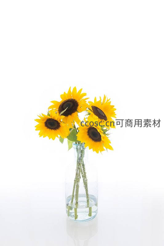 几朵盛开的向日葵插在透明玻璃花瓶中,茎秆浸于清水,背景纯白,构图简洁,光线明亮,展现自然与生活的美好。