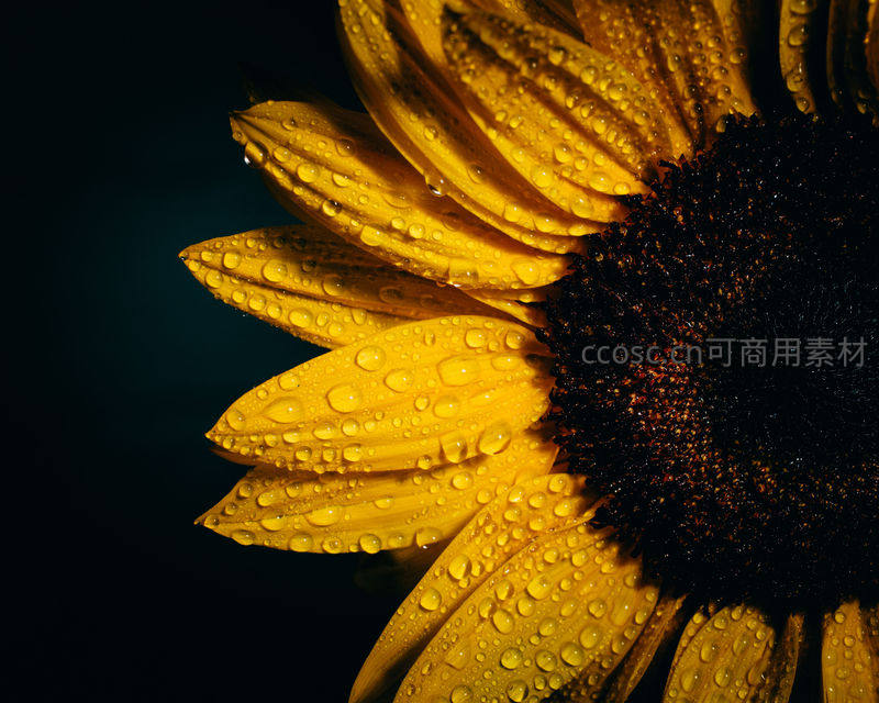 向日葵花瓣上布满晶莹剔透的露珠,在深色背景下显得格外鲜亮,微距镜头捕捉到花瓣细腻纹理和水珠折射的光芒。