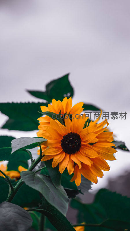 在灰蒙蒙的天空下,一朵橙色向日葵静静绽放,深绿色叶片环绕,整体色调柔和,营造出宁静而略带忧郁的自然氛围。