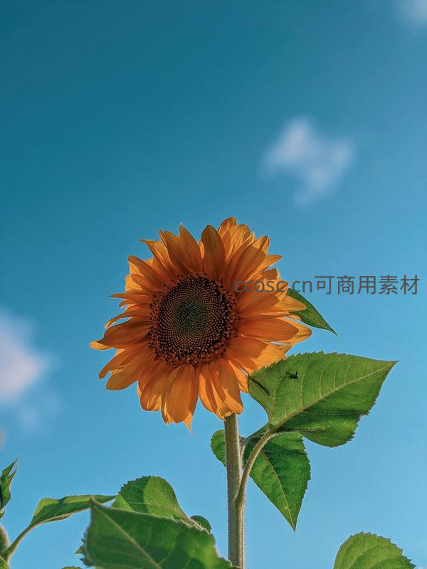一株高大的向日葵在清澈蓝天和朵朵白云下昂扬向上,绿叶舒展,象征着积极乐观的生活态度与自然的蓬勃力量。