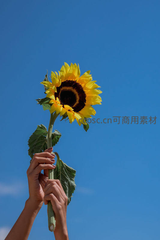 一双温柔的手将一朵盛开的向日葵高高举起,对着纯净的蓝色天空,象征着对生活的热爱、对未来的希望以及拥抱阳光的积极心态。