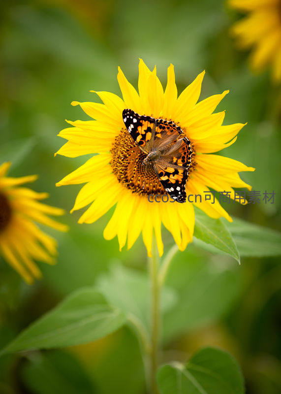 一只斑斓的蝴蝶停歇在盛开的向日葵花心上,翅膀上的花纹清晰可见,背景虚化突出主体,捕捉了自然界中动植物和谐共生的美好瞬间。