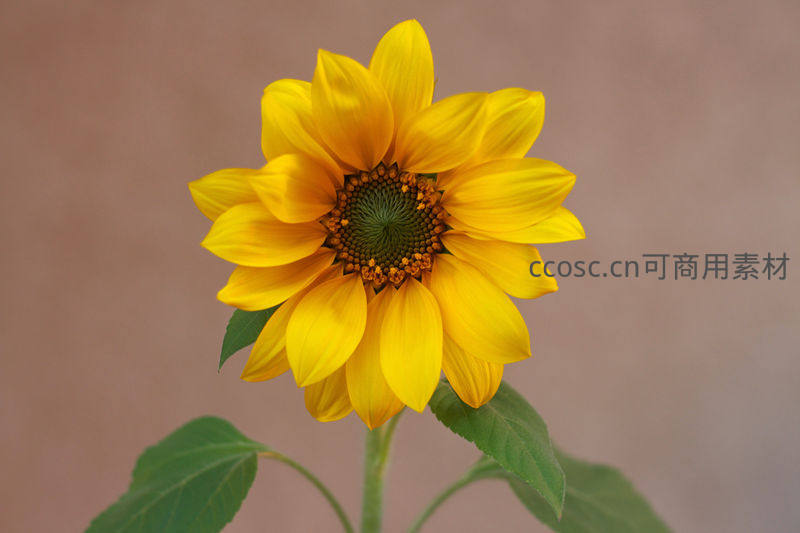 一朵向日葵在柔和光线下被清晰捕捉,从饱满的黄色花瓣到中心精密的花盘结构,再到衬托的绿叶,每一处细节都展现着自然的精妙。