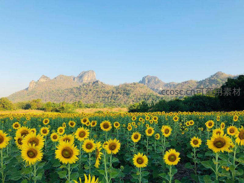 一片广袤的向日葵花田铺展在连绵起伏的山峦脚下,整齐排列的花朵沐浴在明媚阳光下,远处青翠山峦与湛蓝天空共同勾勒出壮丽的田园风光。