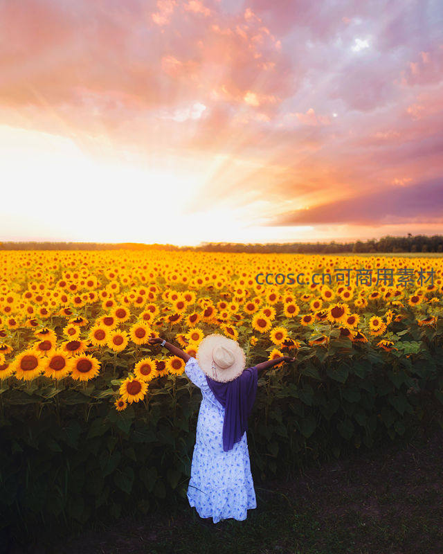 一位身着长裙、头戴草帽的女孩背对镜头,张开双臂拥抱眼前无边的向日葵花海,夕阳的光辉洒满全身,洋溢着自由与喜悦。