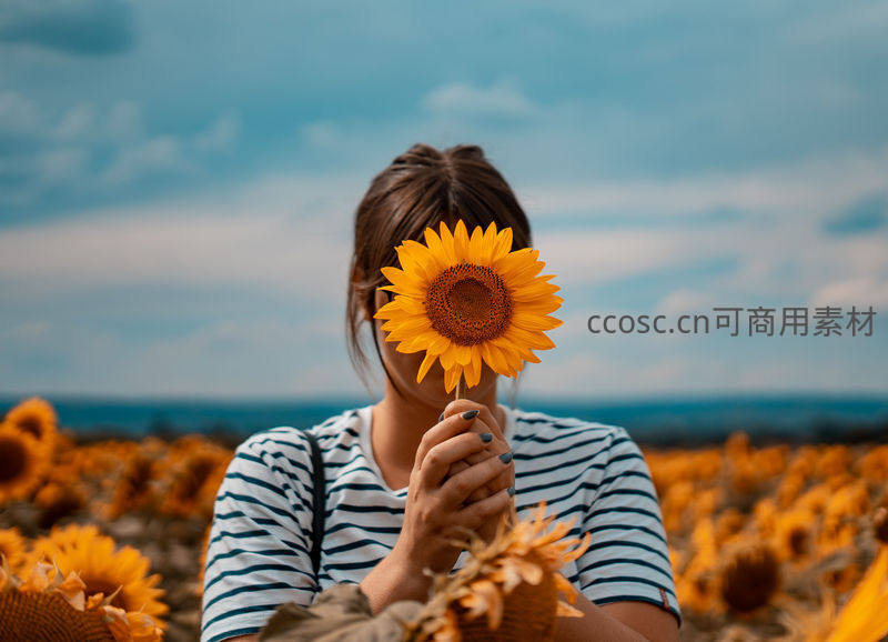 女子手捧向日葵遮面,花海背景意境悠然