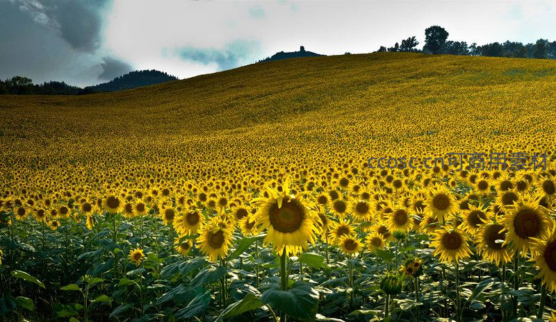 一片浩瀚的向日葵田沿着起伏的山丘铺展,阳光穿透云层洒下斑驳光影,形成层次分明的金色波浪,展现出大自然的壮丽与农业景观的和谐之美。