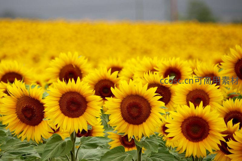 广阔无垠的向日葵田在视野中延伸,整齐排列的花朵如金色海洋,象征农业丰收与大地丰饶。