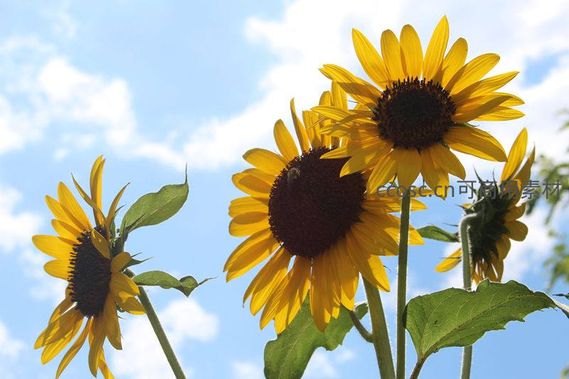 三朵向日葵迎风摇曳,蓝天白云为背景