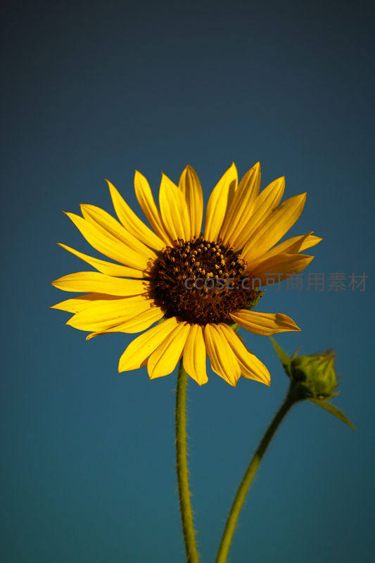 一朵向日葵在纯净的深蓝色背景下独自绽放,强烈的色彩对比和简洁构图赋予画面艺术感,旁边未开的花苞更添一丝静谧与期待。