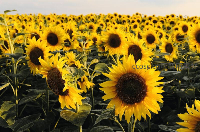 一片无边无际的向日葵花海沐浴在阳光下,金黄色的花朵密集绽放,构成壮观的自然景观,展现了农业种植的丰饶与生命的活力。