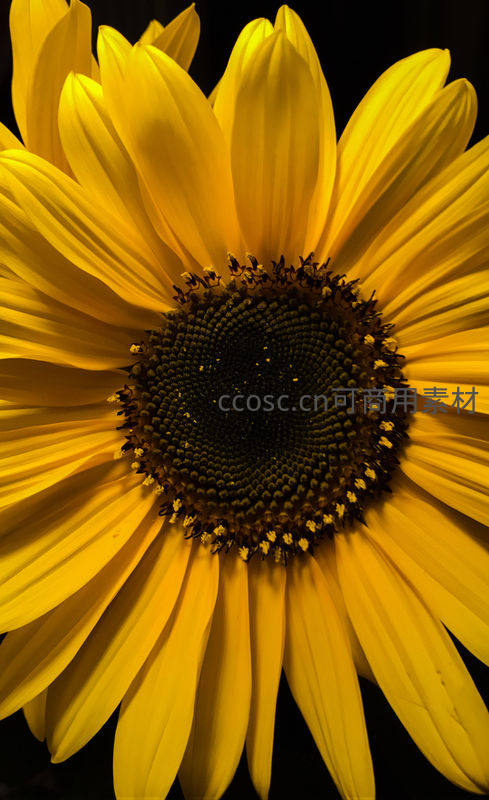 通过微距镜头捕捉向日葵花盘的精细结构,深色花心与明亮花瓣形成强烈对比,展现植物内部精妙的自然美学与生命律动。