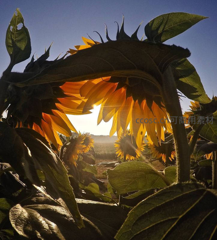 夕阳透过向日葵叶隙洒落