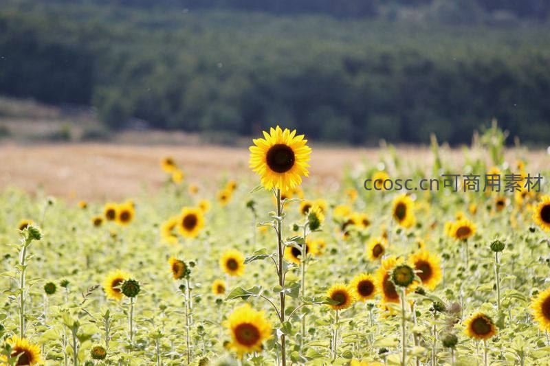 一片广阔的向日葵花田在明媚阳光下盛开,金黄色的花朵随风摇曳,背景是郁郁葱葱的树林,充满自然生机与田园诗意。