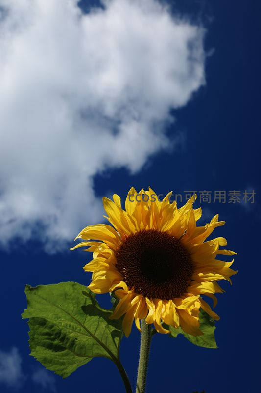 低角度仰拍一朵挺立的向日葵,背后是湛蓝天空与蓬松白云,花朵朝向太阳,象征希望与生命力,画面充满积极向上的能量与自然之美。
