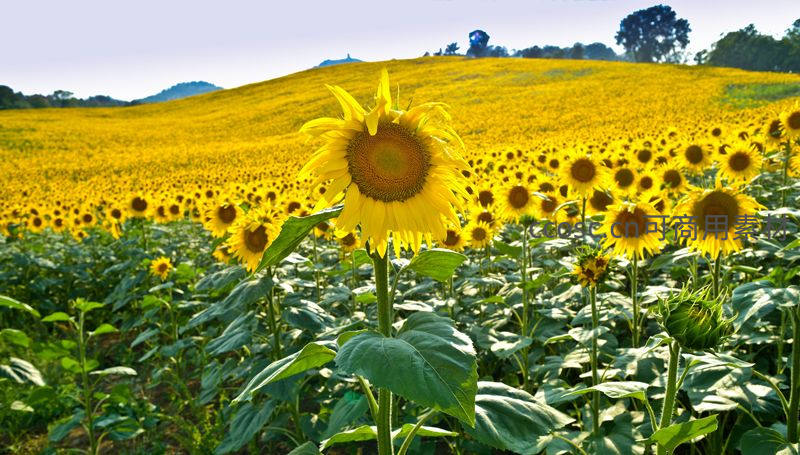 一片无垠的向日葵花海覆盖起伏的山坡,在明媚阳光下如金色海洋般波澜壮阔,令人心旷神怡。