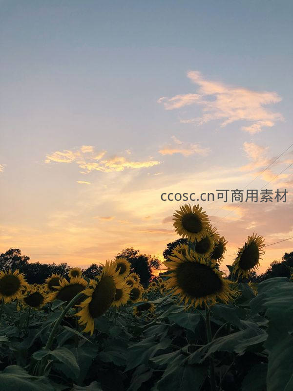 傍晚时分,大片向日葵在落日余晖中绽放,金黄色的花瓣与橙红天空交相辉映,构成一幅温暖而宁静的田园画卷。