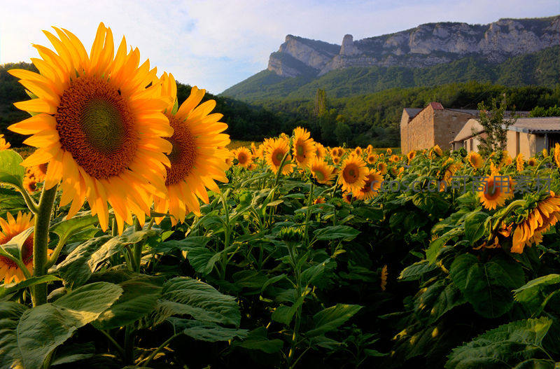 大片向日葵在山脚下的田野里绽放,远处是连绵起伏的绿色山脉和农舍,构成一幅宁静优美的乡村田园画卷。