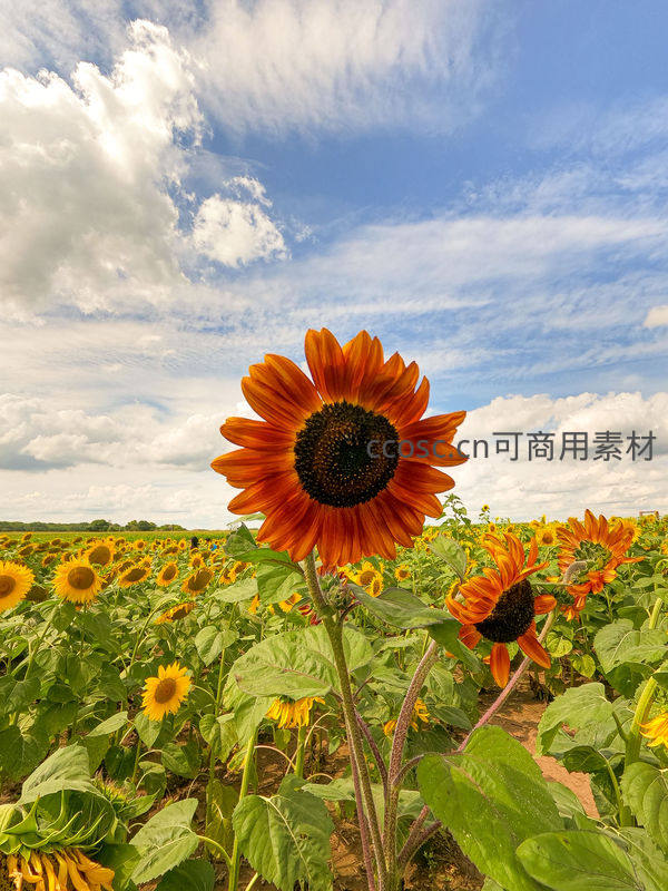 一株橙红色的向日葵在广阔花田中傲然挺立,头顶是辽阔的蓝天与飘逸的白云,色彩鲜明,画面开阔而富有诗意。