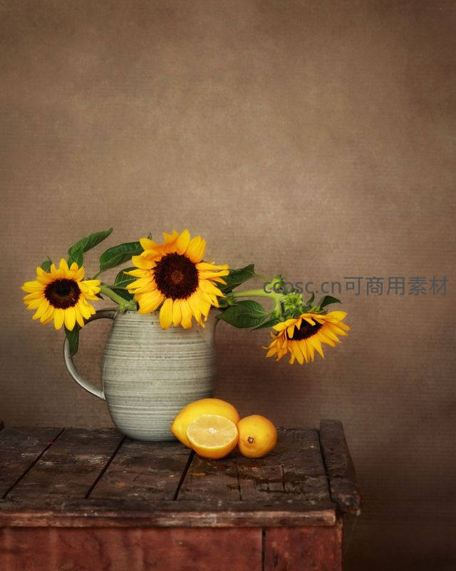 三朵向日葵插在质朴的陶罐中,搭配切开的柠檬置于旧木桌上,营造出温暖、怀旧且富有生活气息的室内静物场景。