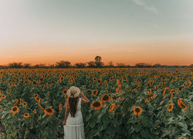 一位身穿白裙的女子站在无垠向日葵花田中,凝望远方绚烂的落日余晖,画面充满诗意、浪漫与对自然的向往之情。