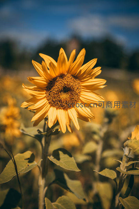 一株饱满的向日葵独立挺立于田野之中,背景是朦胧的蓝天与远处的植被,阳光洒在花瓣上,展现出自然的静谧与蓬勃的生命力。