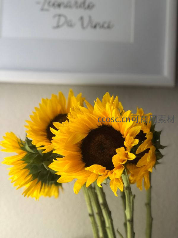 三朵向日葵插在瓶中置于室内,背景墙上挂有“达芬奇”字样的画框,整体氛围温馨文艺,体现居家生活的美好与雅致。