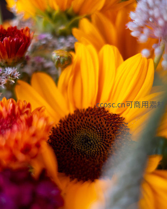 镜头聚焦于向日葵花盘的精细纹理,周围点缀红橙紫各色小花,色彩斑斓,层次丰富,展现花卉世界的细腻与绚烂之美。
