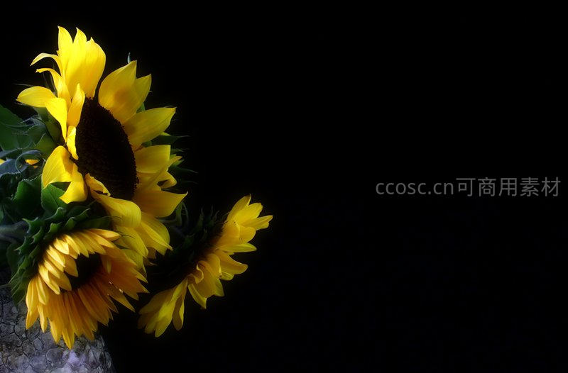 几朵向日葵在纯黑背景前被聚光灯照亮,强烈的明暗对比凸显其金黄色彩与轮廓,营造出静谧、孤独又充满力量的艺术感。