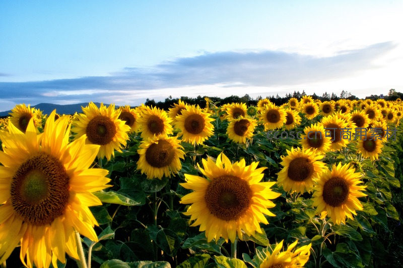 无垠的向日葵花田在蓝天白云下铺展,夕阳余晖洒落,远处青山如黛,营造出宁静祥和的田园画卷。