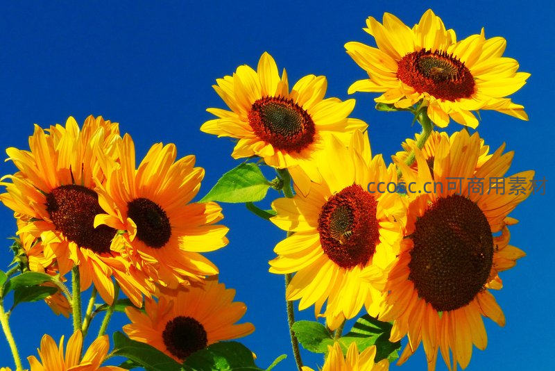 金黄的向日葵在纯净的蓝色天空下盛开,花瓣饱满,花盘深邃,绿叶衬托,展现出旺盛的生命力与夏日的明媚活力。