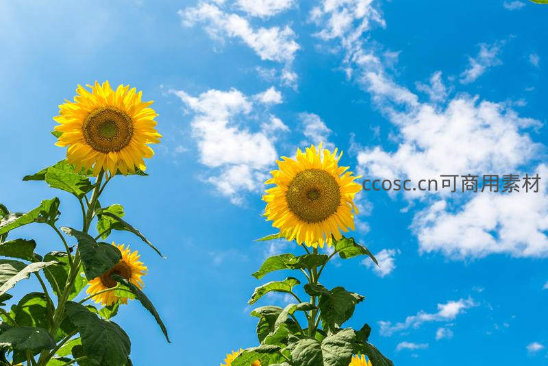 从低角度仰拍两朵高耸的向日葵,它们向着广阔的蓝天白云伸展,绿叶繁茂,象征着积极向上、追逐光明的乐观精神。