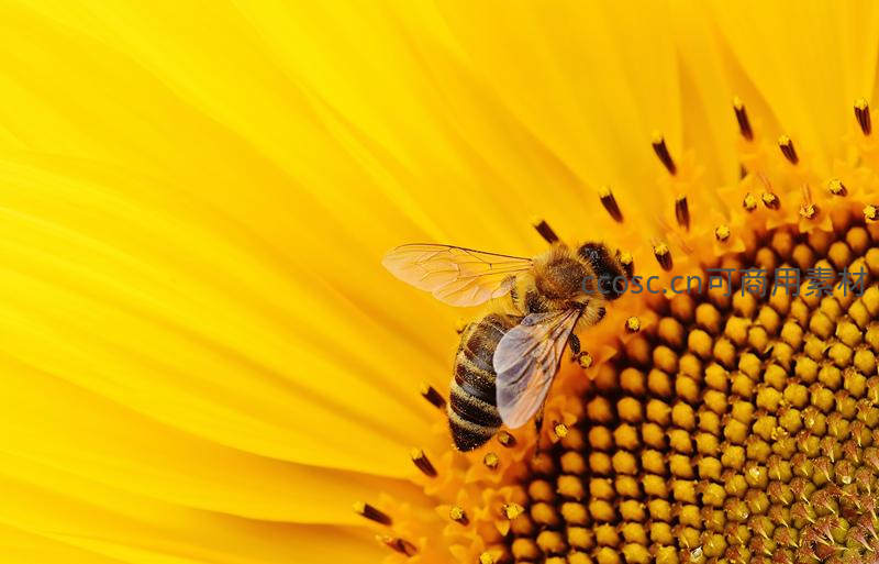 蜜蜂在向日葵花心辛勤采蜜,微距展现自然和谐