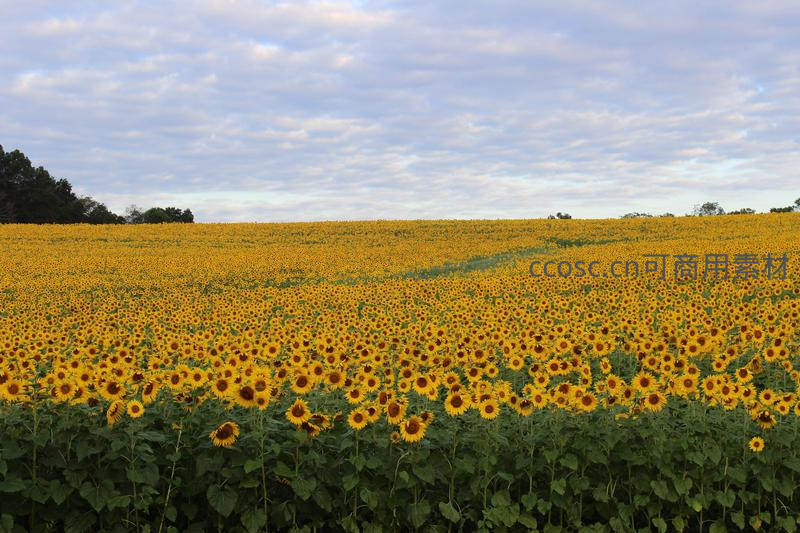 无垠的向日葵花田在晨曦中铺展,金黄花浪随风起伏,远处树影朦胧,天空云卷云舒,展现宁静而壮丽的田园画卷。